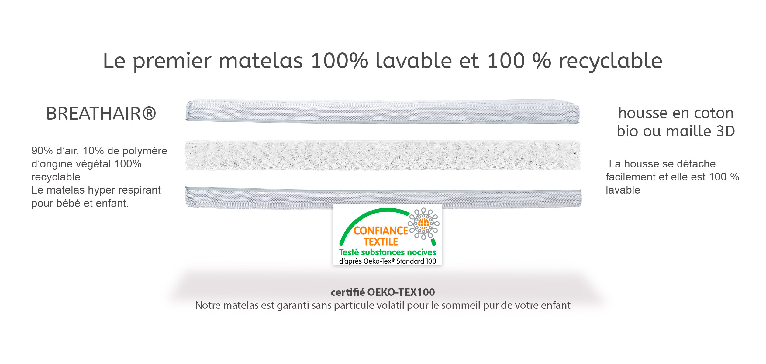 Toyobo , une société japonaise, a mis au point le matelas enfant bio, naturel et écologique grâce à la technique BREATHAIR© qui contient 90% d’air.